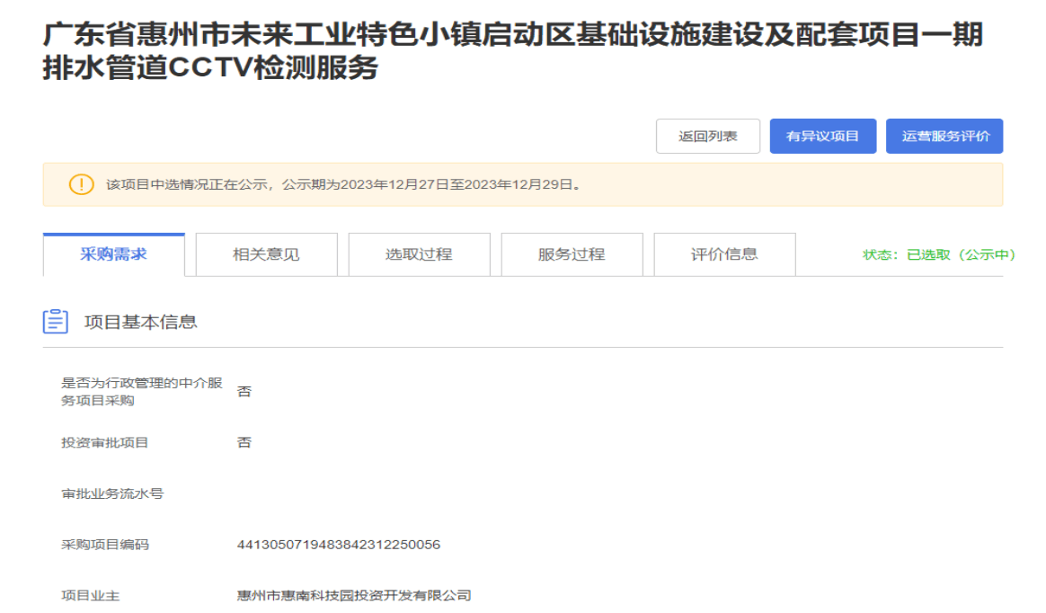 【招标公示】广东省惠州市未来工业特色小镇启动区基础设施建设及配套项目一期排水管道CCTV检测服务