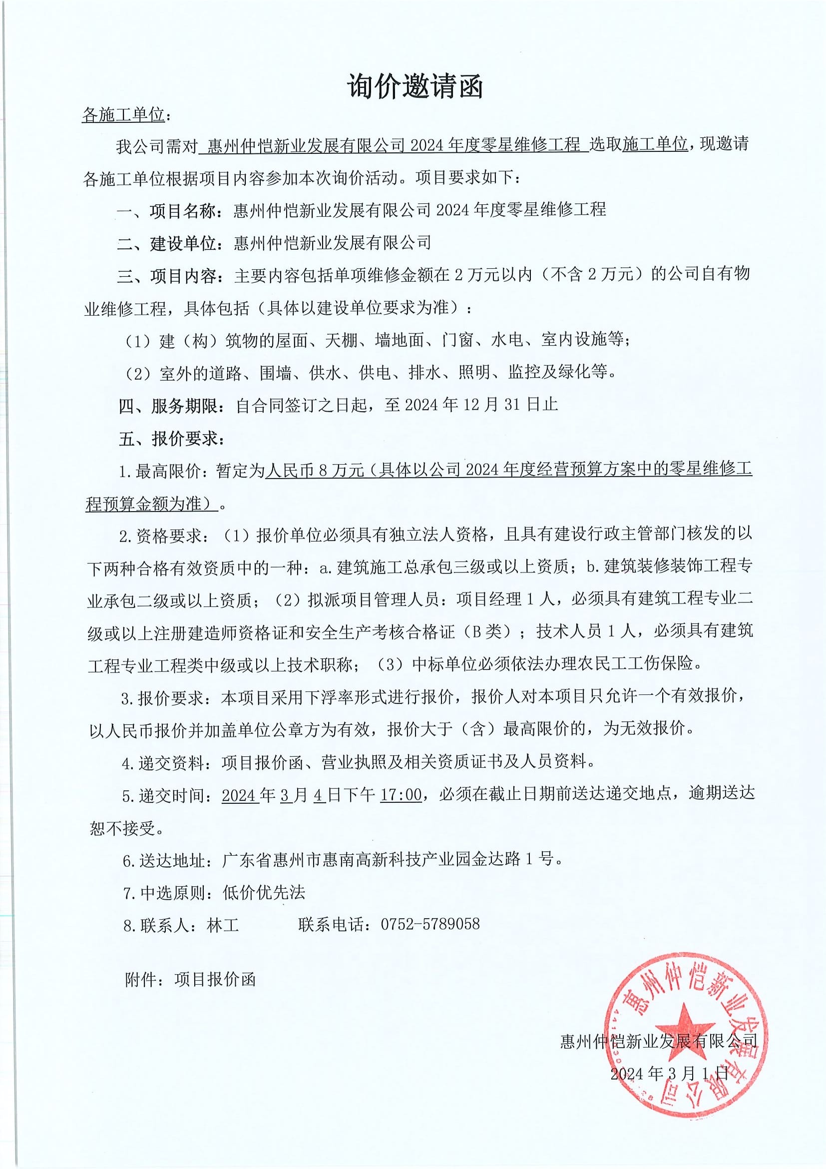 惠州仲恺新业发展有限公司2024年度零星维修工程