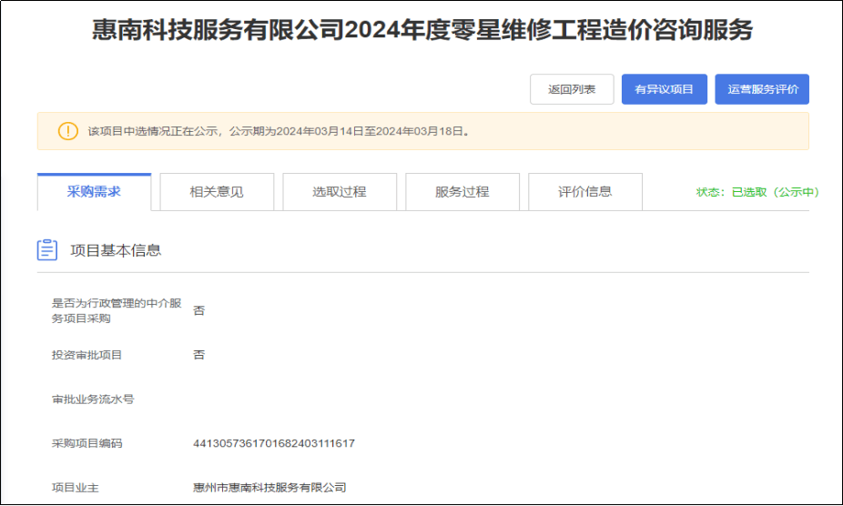 惠南科技服务有限公司2024年度零星维修工程造价咨询服务