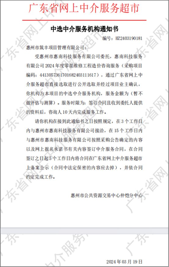 中选中介服务机构通知书(惠南科技公司2024年度零星维修工程造价咨询服务)