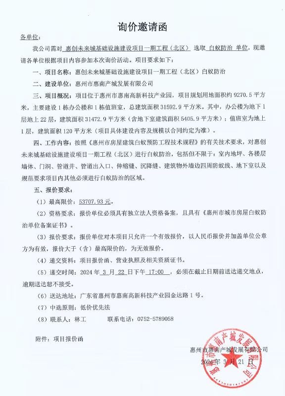 惠创未来城基础设施建设项目一期工程(北区)白蚁防治询价邀请函
