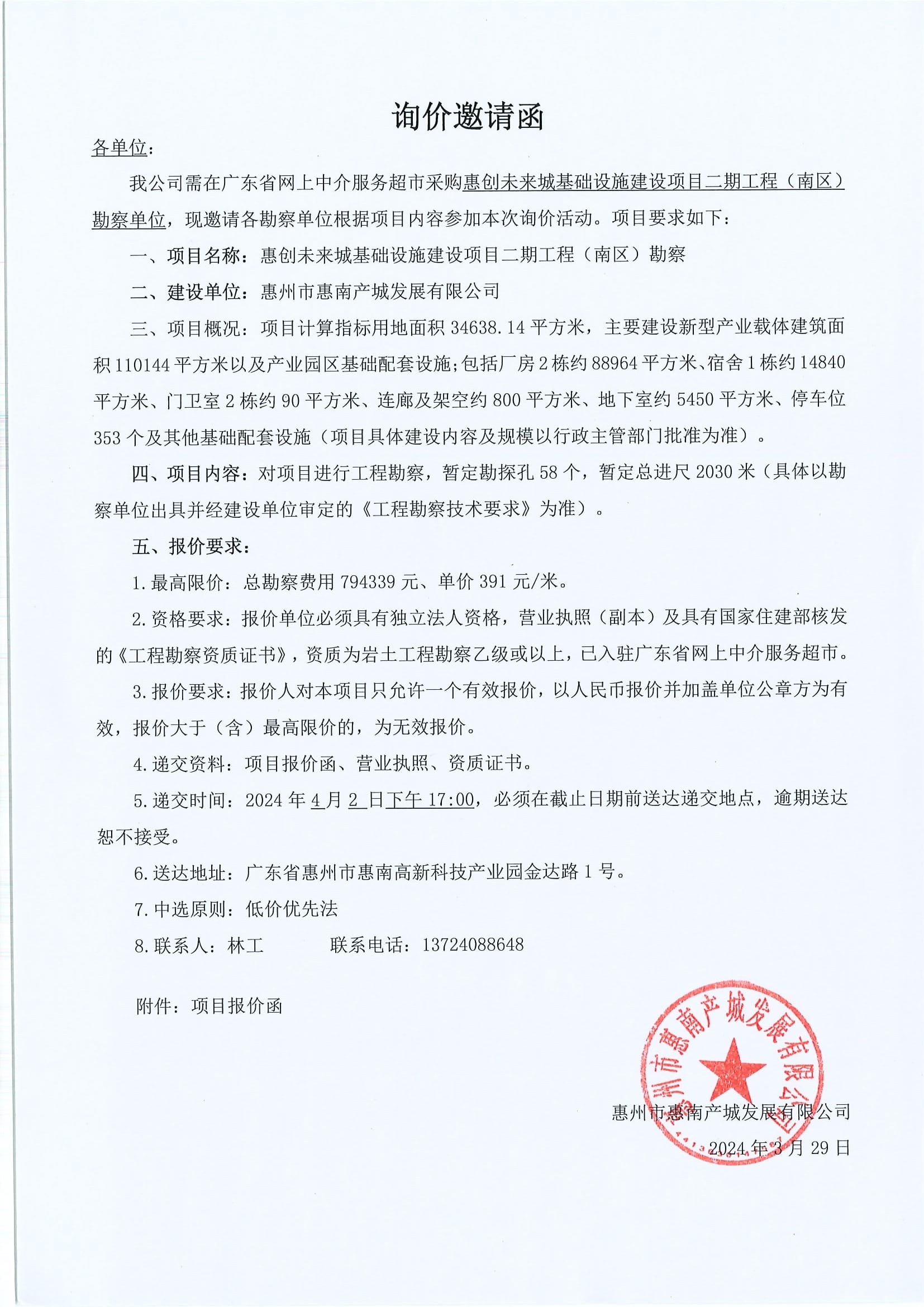 惠创未来城基础设施建设项目二期工程(南区)勘察询价邀请函