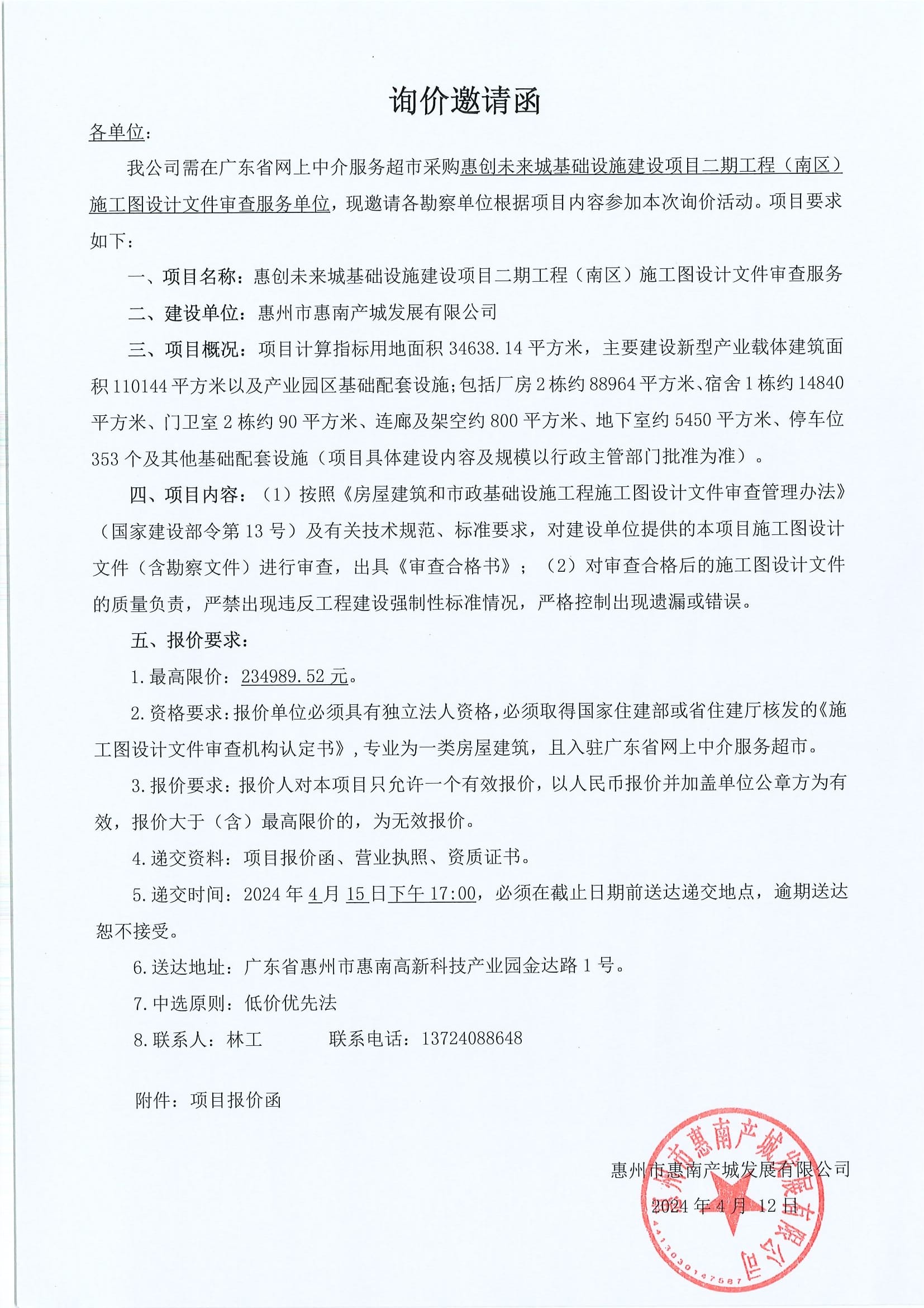 惠创未来城基础设施建设项目二期工程(南区)施工图设计文件审查服务询价邀请函