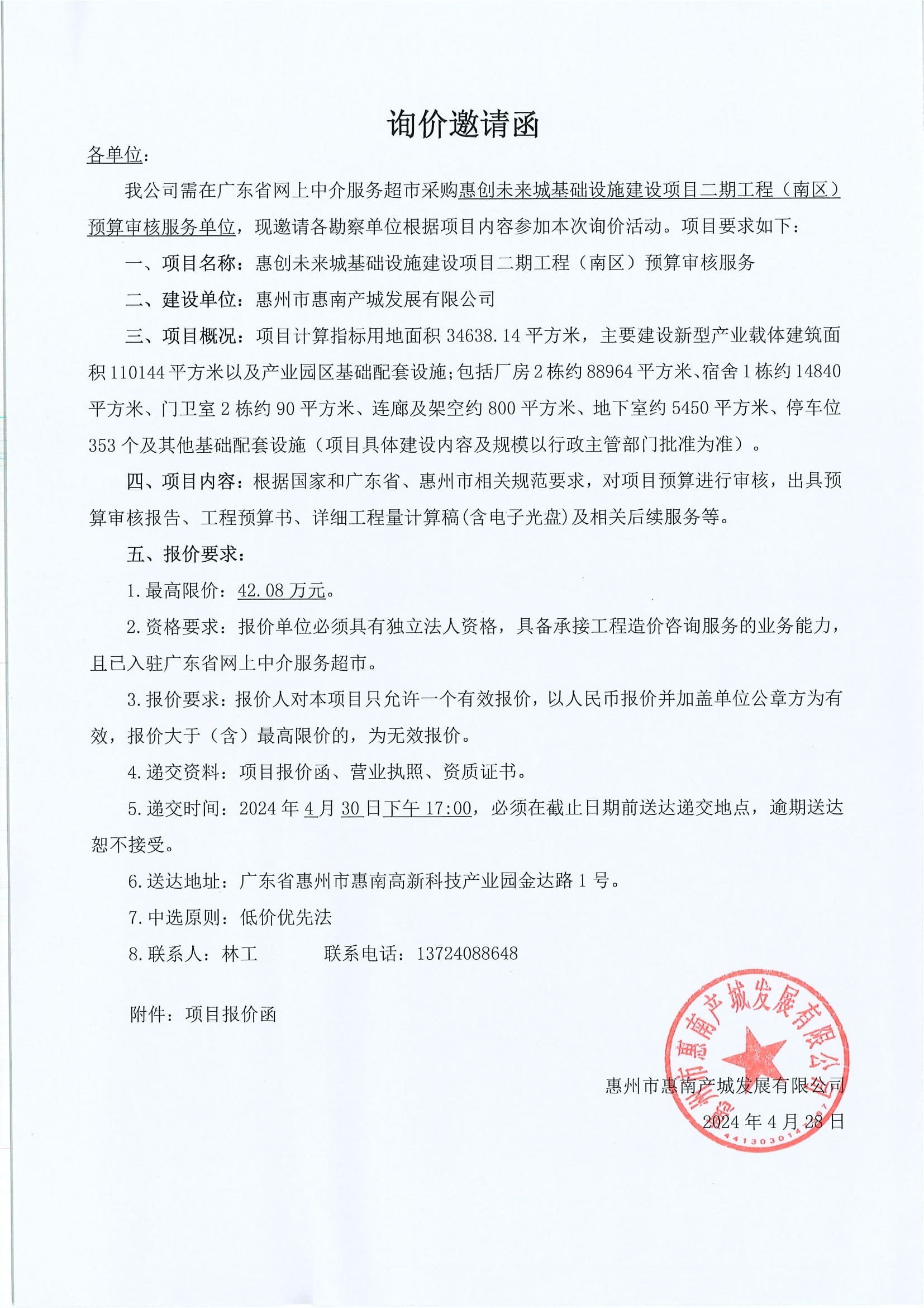 惠创未来城基础设施建设项目二期工程(南区)预算审核服务询价邀请函