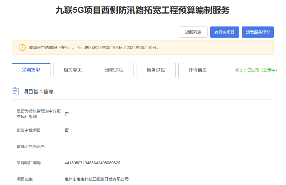 【公示】九联5G项目西侧防汛路拓宽工程预算编制服务