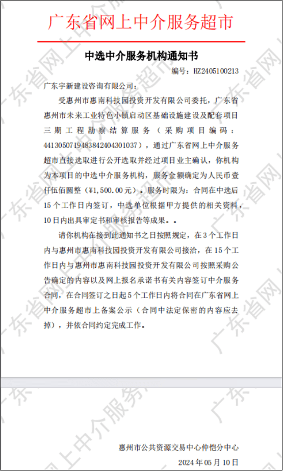 【中选公示】广东省惠州市未来工业特色小镇启动区基础设施建设及配套项目三期工程勘察结算服务