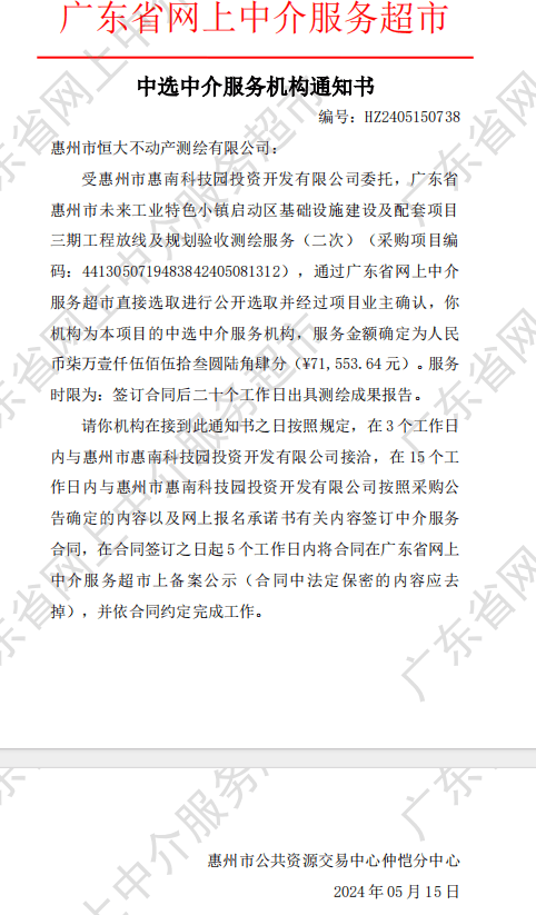 【中选公示】广东省惠州市未来工业特色小镇启动区基础设施建设及配套项目三期工程放线及规划验收测绘服务(二次)