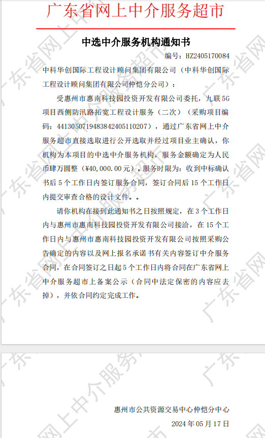 【中选公示】九联5G 项目西侧防汛路拓宽工程设计服务(二次)