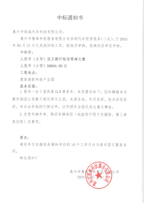 【中标通知】惠州市惠南科技服务有限公司采购汽车租赁服务(二次)