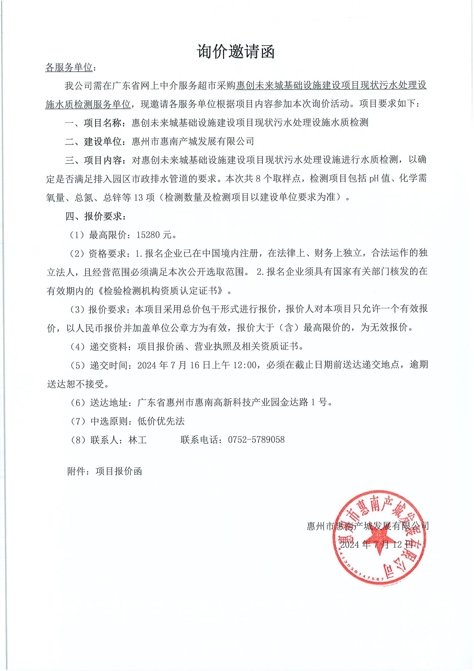 惠创未来城基础设施建设项目现状污水处理设施水质检测询价邀请函
