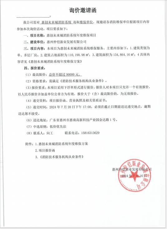 惠创未来城消防系统年度维保项目询价邀请函