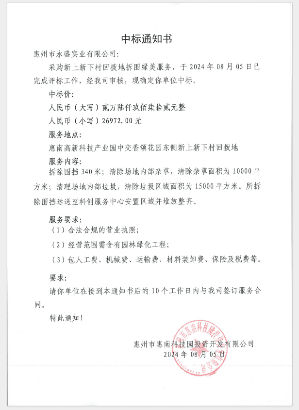 【中标通知】采购新上新下村回拨地拆围绿美服务