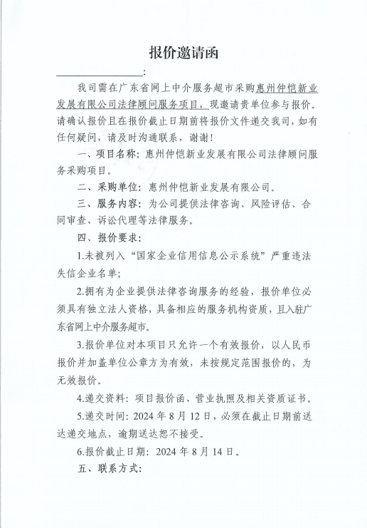 惠州仲恺新业发展有限公司法律顾问服务项目