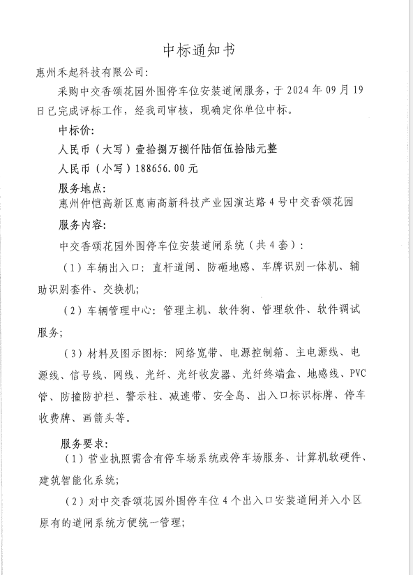 【中标通知】采购中交香颂花园外围停车位安装道闸服务