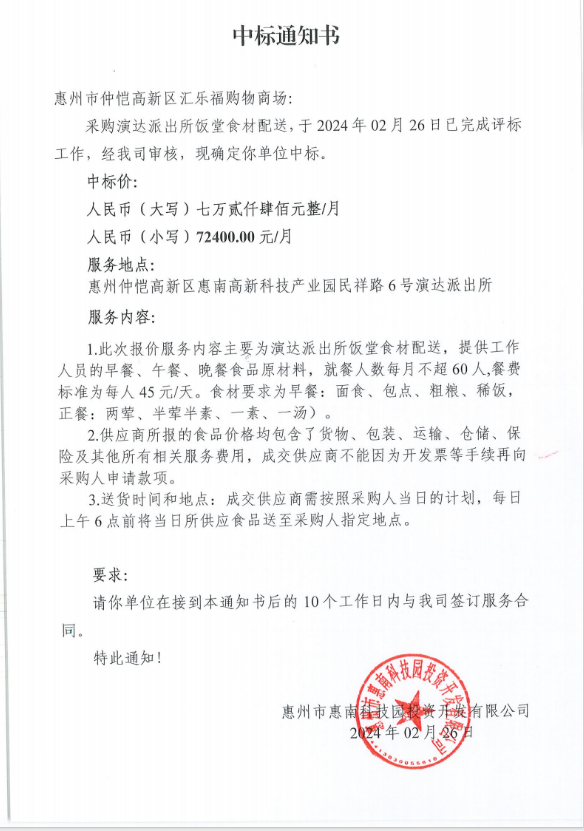 【中标通知】演达派出所饭堂食材配送