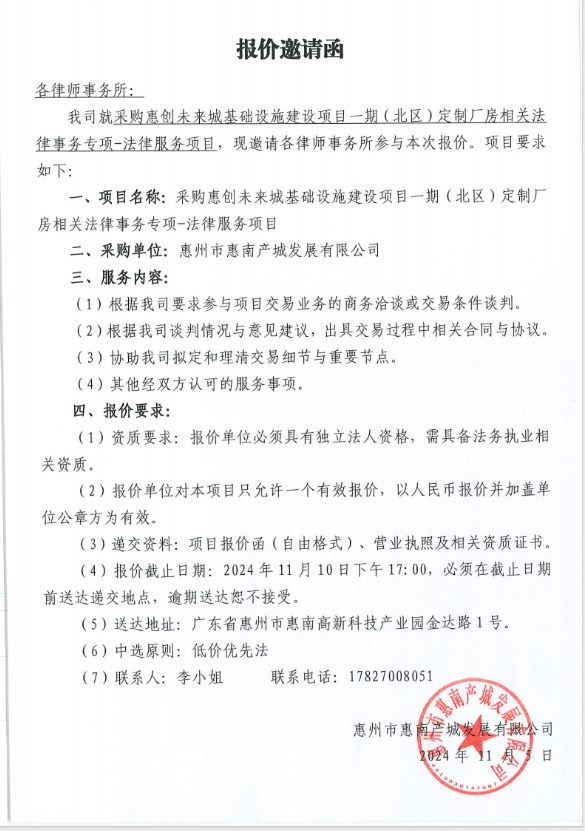 采购惠创未来城基础设施建设项目一期(北区)定制厂房相关法律事务专项-法律服务项目