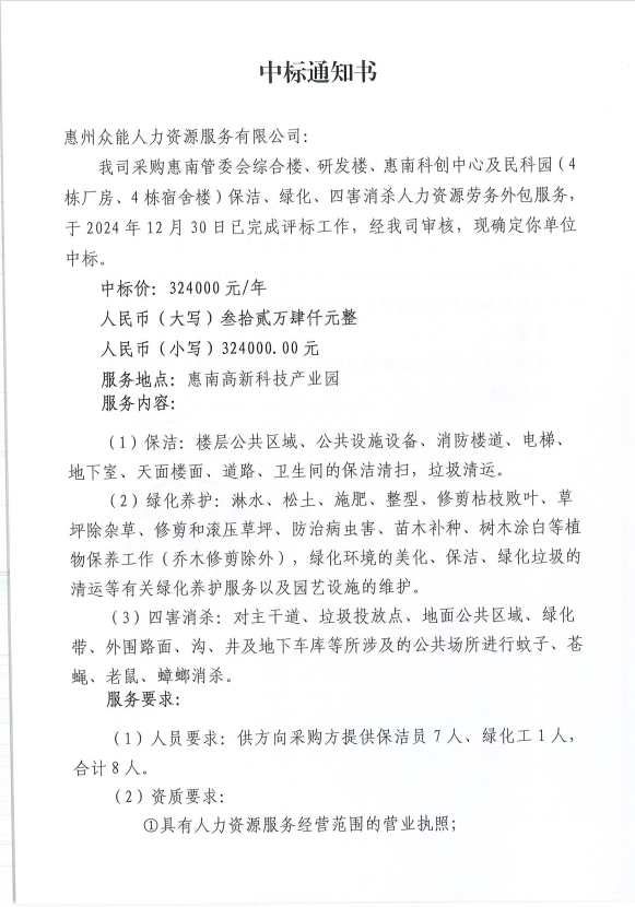 【中标通知】采购惠南管委会综合楼、研发楼、惠南科创中心及民科园(4 栋厂房、4栋宿舍楼)保洁、绿化、四害消杀人力资源劳务外包服务