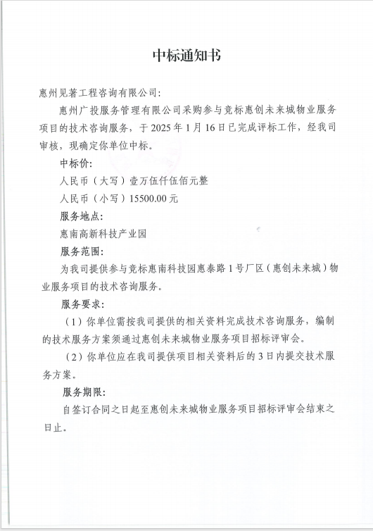 【中标通知】惠创未来城物业服务项目的技术咨询服务