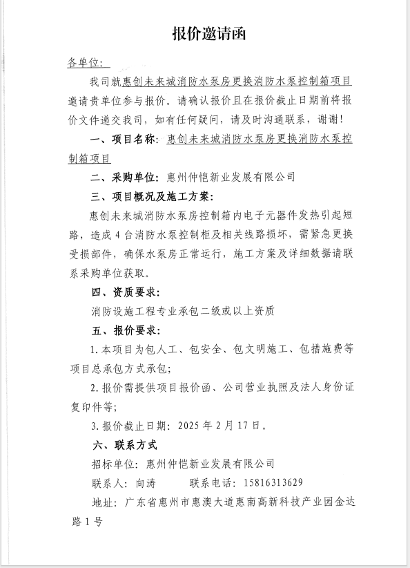 【报价邀请函】惠创未来城厂区水泵房柴油泵及配套设施维修项目