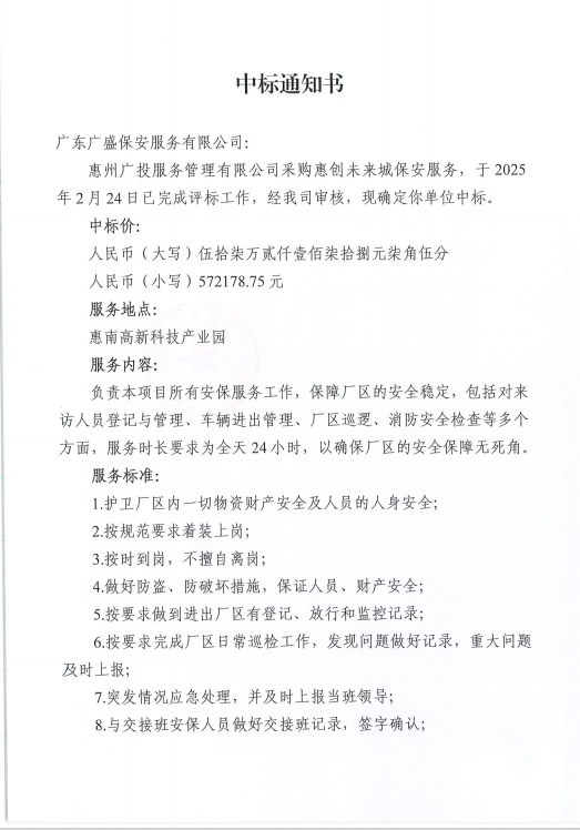 【中标通知】采购惠南科技园工人文化宫安保服务项目