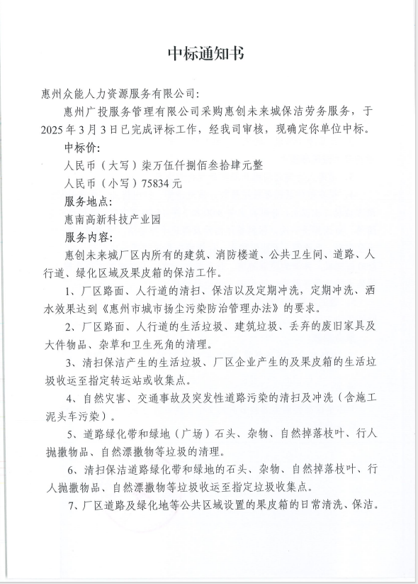【中标通知】采购惠创未来城保洁劳务服务