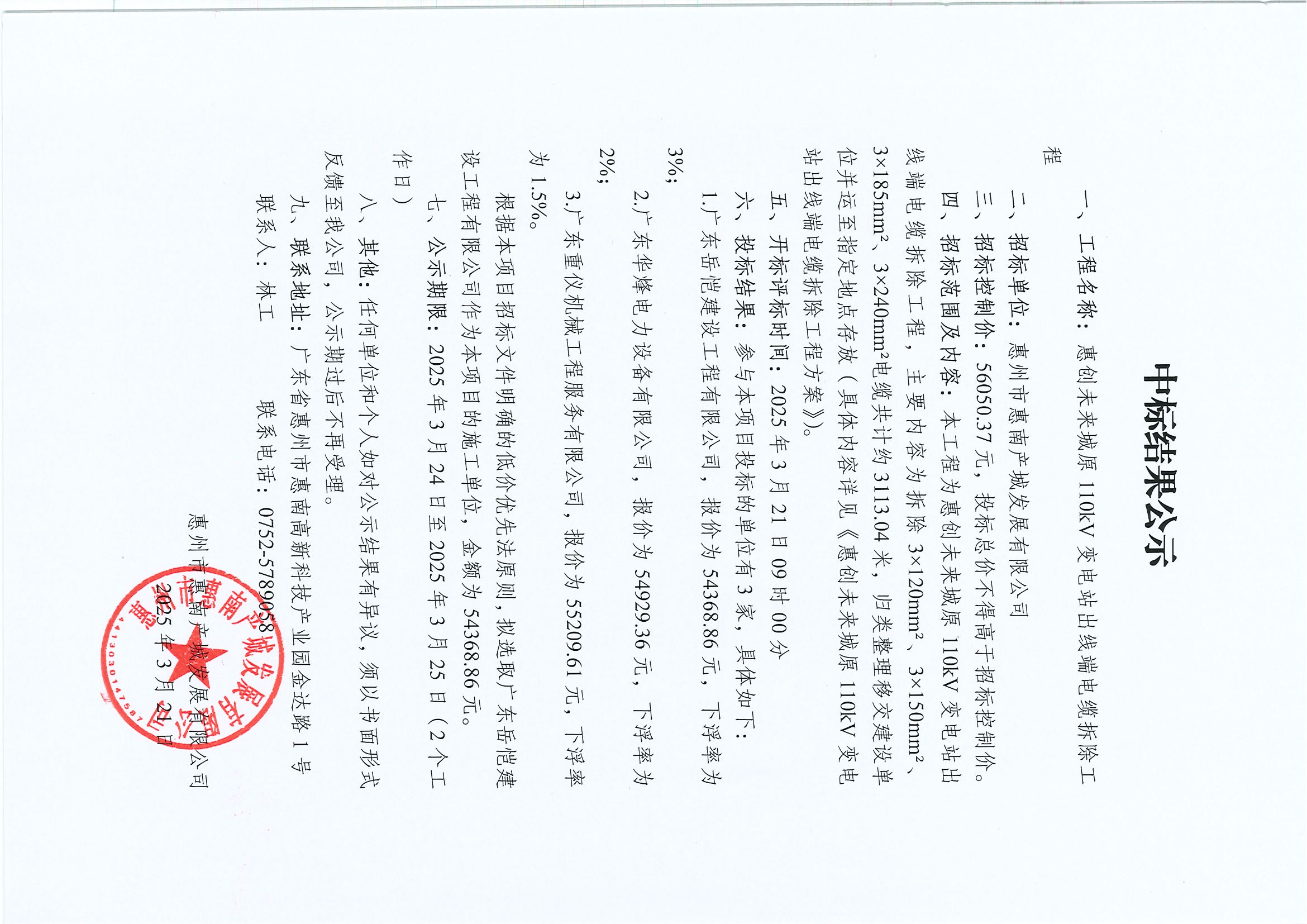 【中标结果公示】惠创未来城原110kV变电站出线端电缆拆除工程