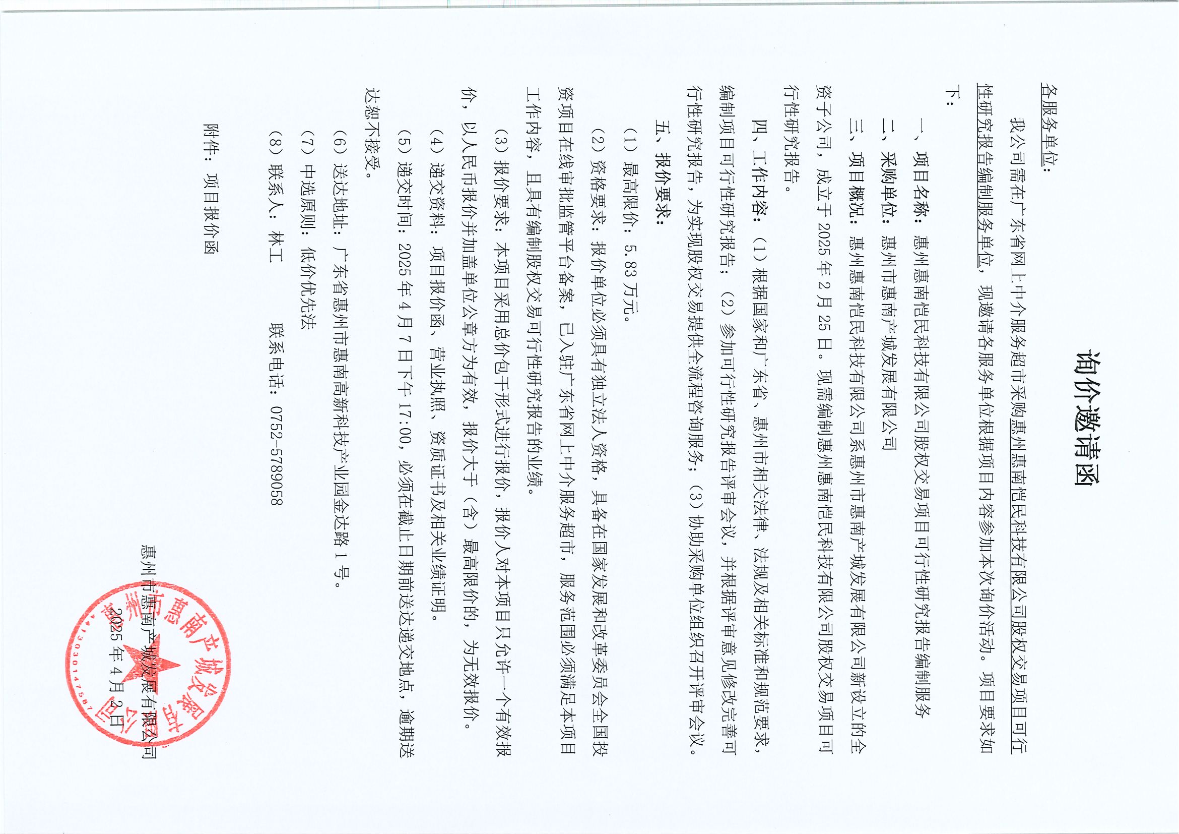 【询价邀请函】惠州惠南恺民科技有限公司股权交易项目可行性研究报告编制服务