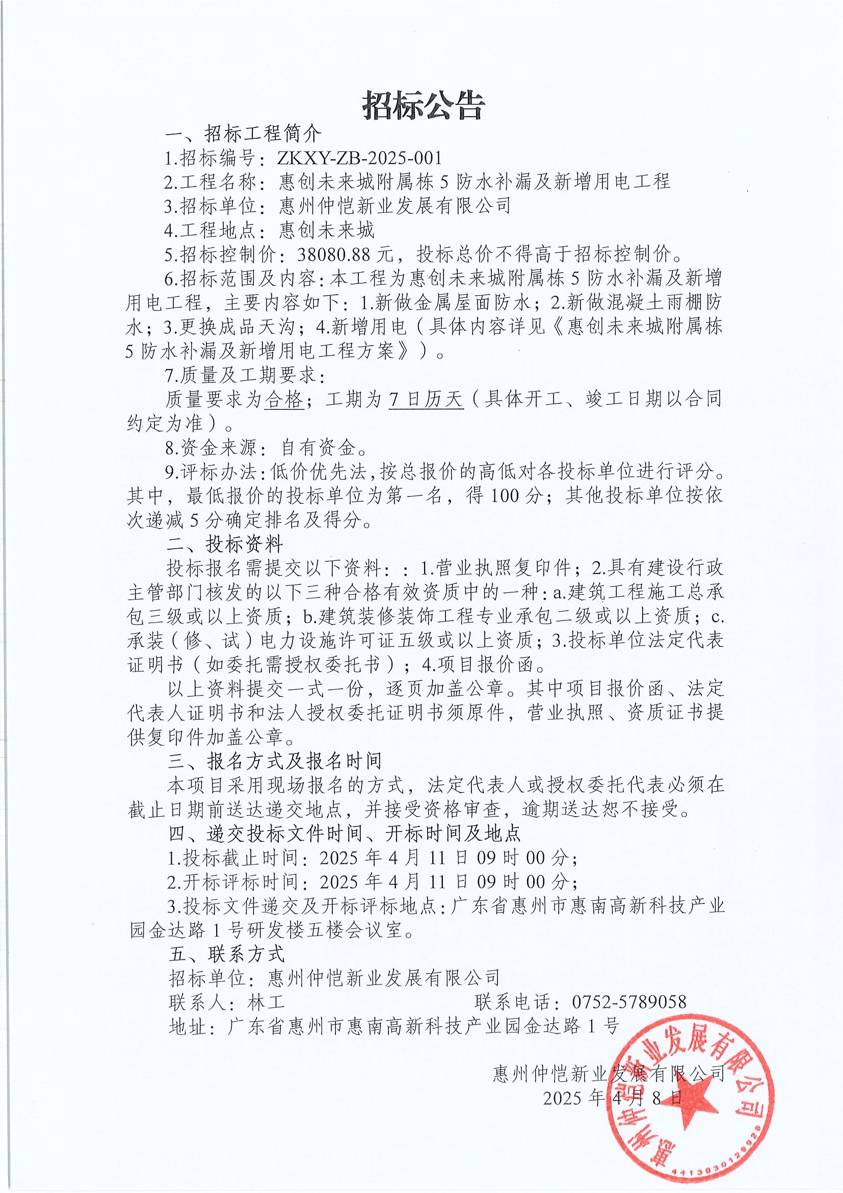 【招标公告】惠创未来城附属栋5防水补漏及新增用电工程