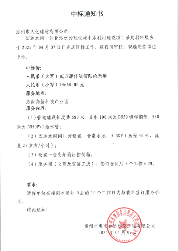 【中标通知】宏达水闸一体化污水处理设施中水利用建设项目采购材料服务