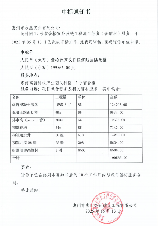 【中标通知】民科园12号宿舍楼室外改造工程施工劳务(含辅材)服务