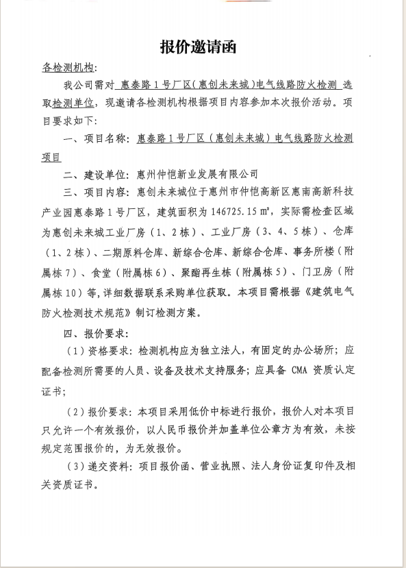 【报价邀请函】惠泰路1号厂区(惠创未来城)电气线路防火检测