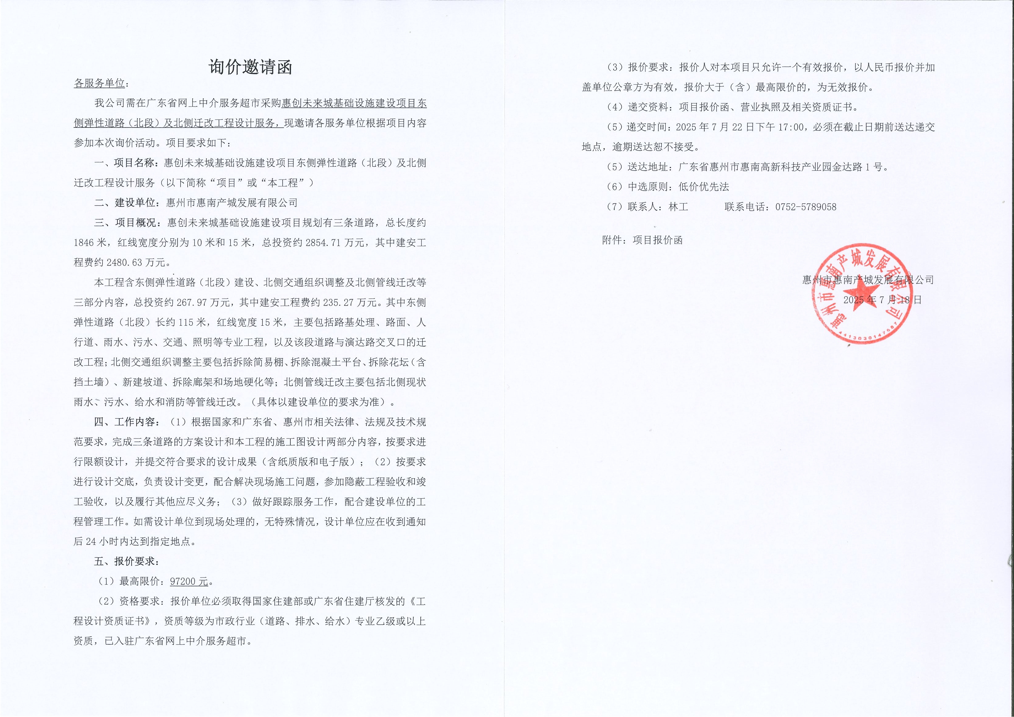 【询价邀请函】惠创未来城基础设施建设项目东侧弹性道路(北段)及北侧迁改工程设计服务