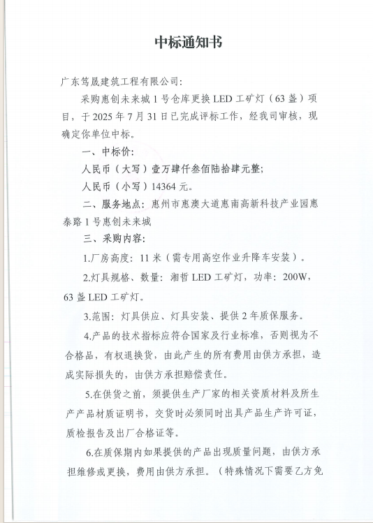 【中标通知】采购惠创未来城1号仓库更换LED工矿灯(63盏)项目