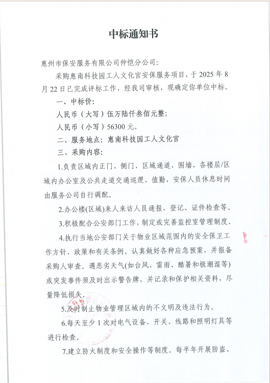 【中标通知】采购惠南科技园工人文化宫安保服务项目