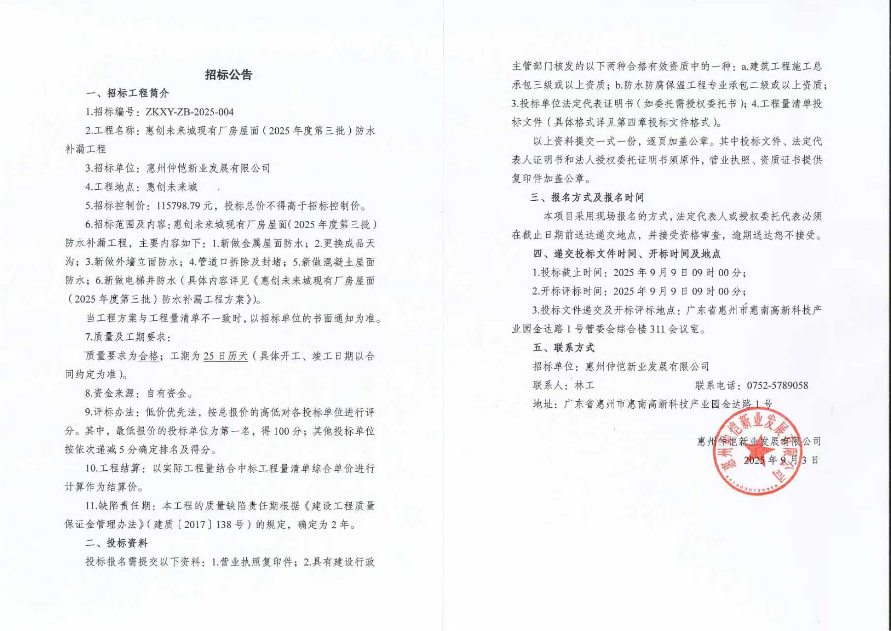 【招标公告】惠创未来城现有厂房屋面(2025年度第四批)防水补漏工程