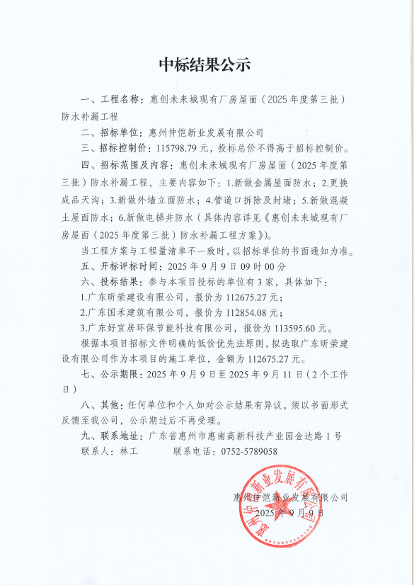 【中标结果公示】惠创未来城现有厂房屋面(2025年度第三批)防水补漏工程