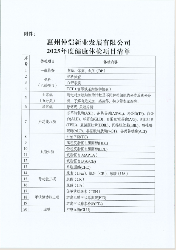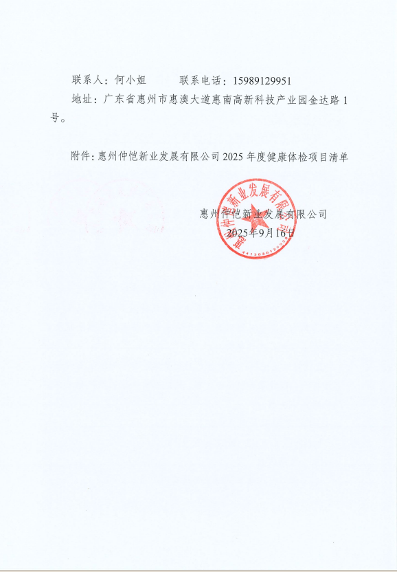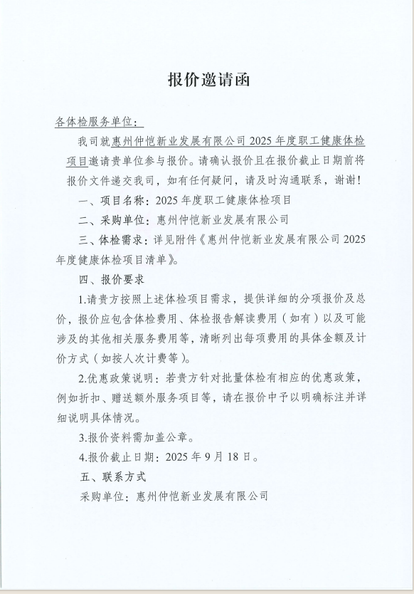 【报价邀请函】惠州仲恺新业发展有限公司2025年度职工健康体检项目