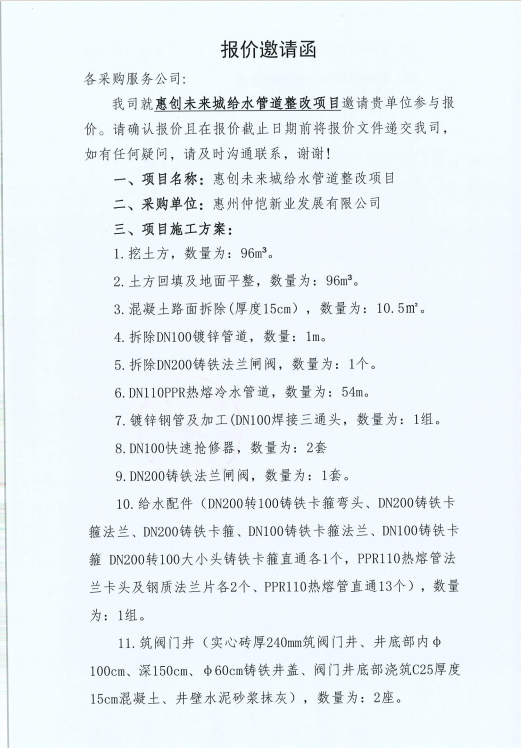 【报价邀请函】惠创未来城厂区水泵房柴油泵及配套设施维修项目
