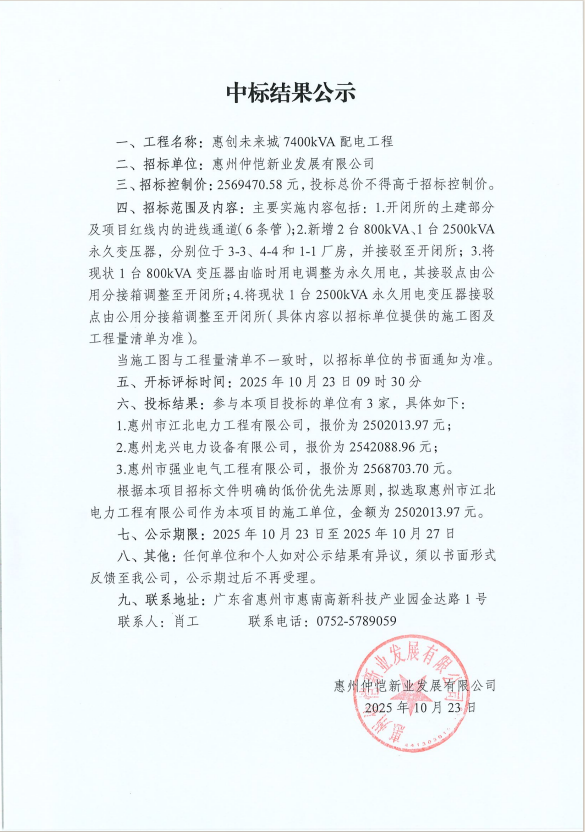 【中标结果公示】惠创未来城7400kVA配电工程
