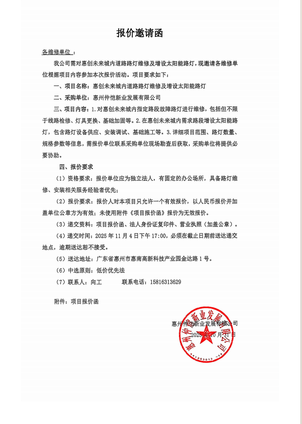 【报价邀请函】惠创未来城内道路路灯维修及增设太阳能路灯