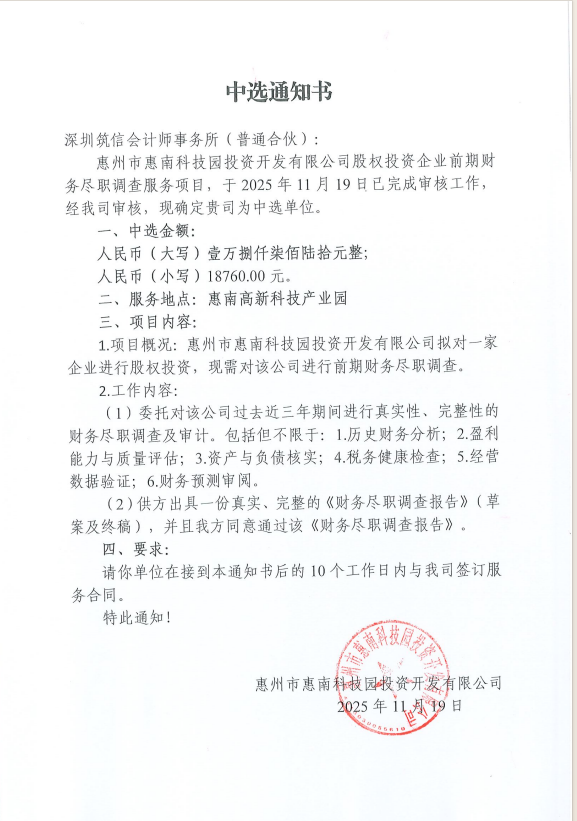 【中选通知】惠州市惠南科技园投资开发有限公司股权投资企业前期财务尽职调查服务项目