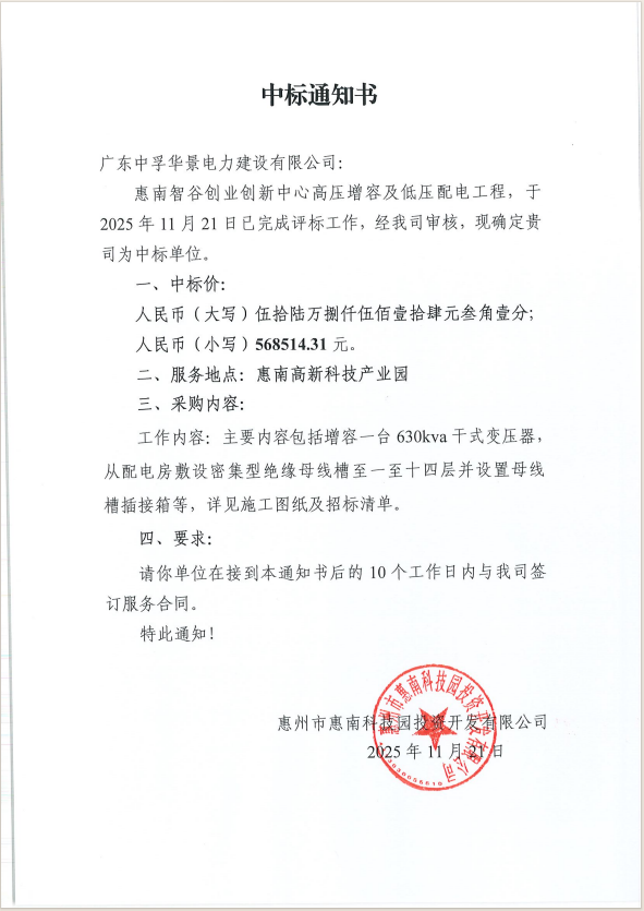 【中标通知】惠南智谷创业创新中心高压增容及低压配电工程