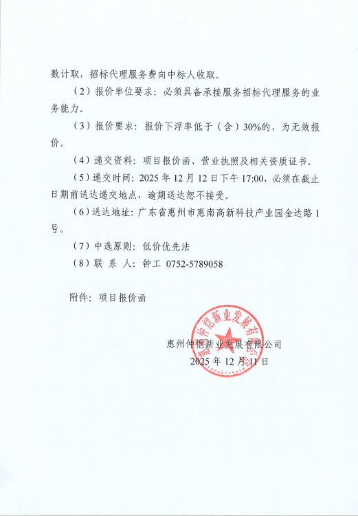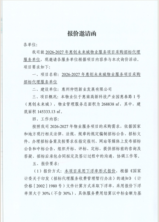 【报价邀请函】2026-2027年惠创未来城物业服务项目采购招标代理服务单位