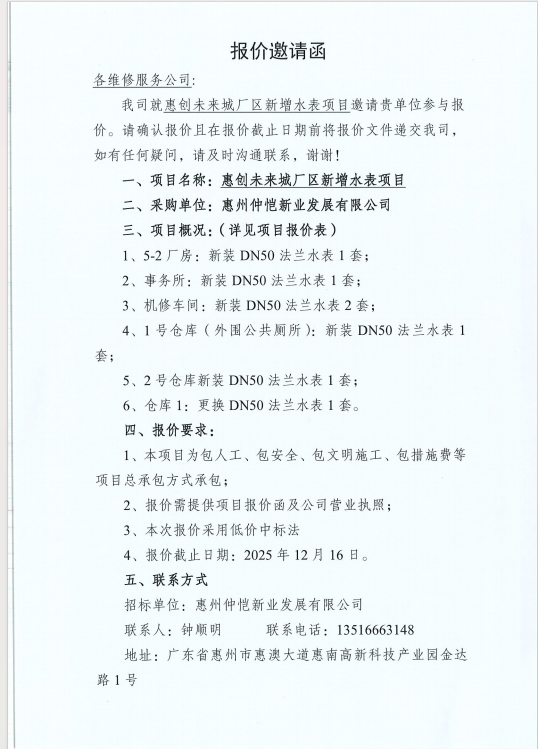 【报价邀请函】惠创未来城厂区厂房1、2、3、4、5栋建筑设施防雷检测项目