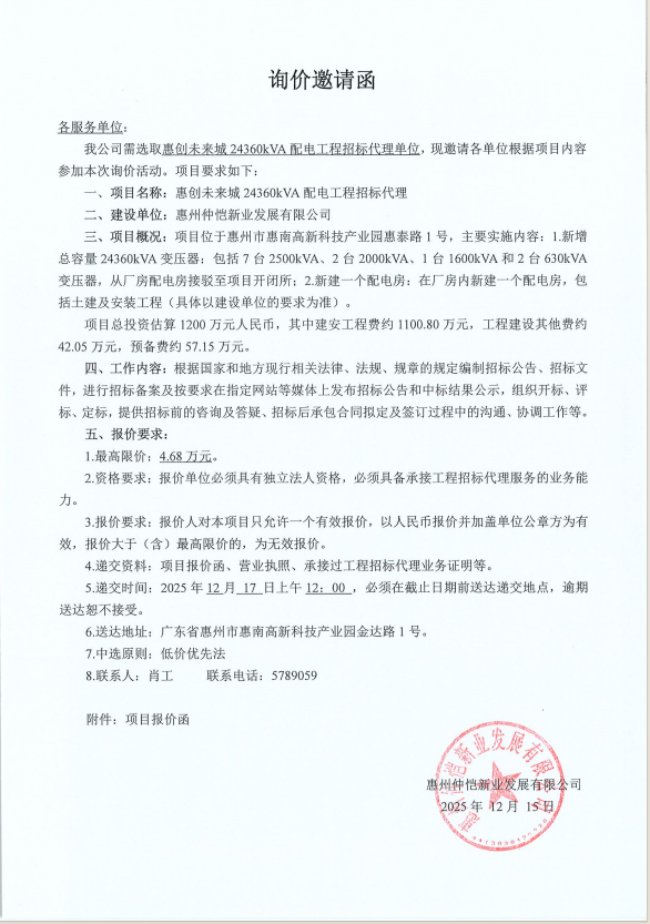 【询价邀请函】选取惠创未来城24360kVA配电工程招标代理单位