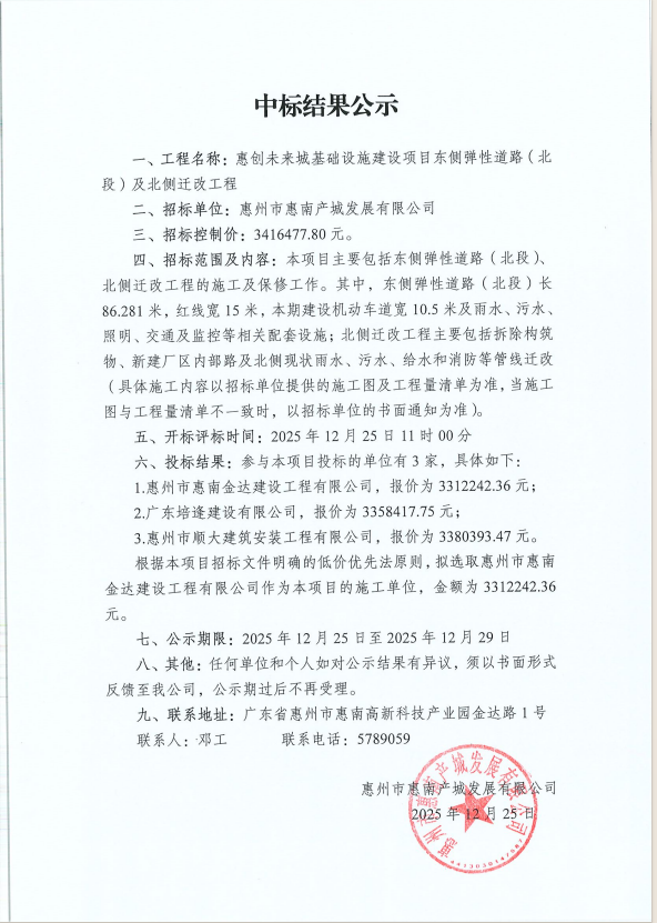 【中标结果公示】惠创未来城基础设施建设项目东侧弹性道路(北段)及北侧迁改工程