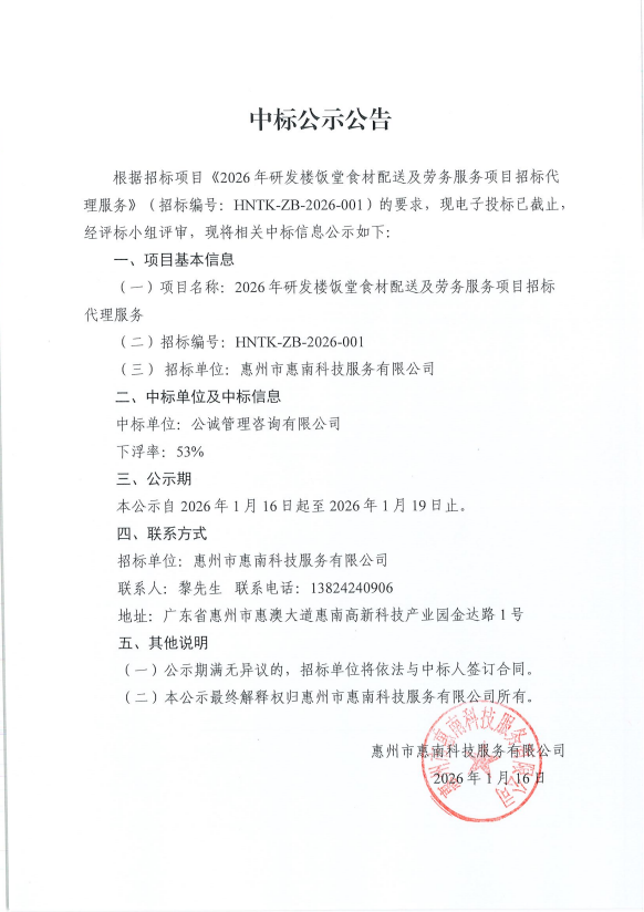 【中标公示】2026年研发楼饭堂食材配送及劳务服务项目招标代理服务