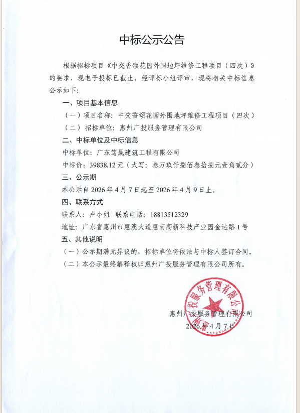 【中标公示】中交香颂花园外围地坪维修工程项目(四次)