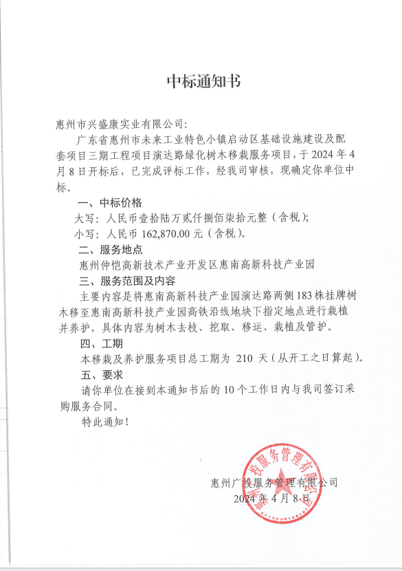 【中标通知】广东省惠州市未来工业特色小镇启动区基础设施建设及配套项目三期工程项目演达路绿化树木移栽服务