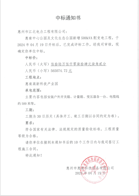 【中标通知】惠南中心公园及文化生态公园新增500kVA配变电工程